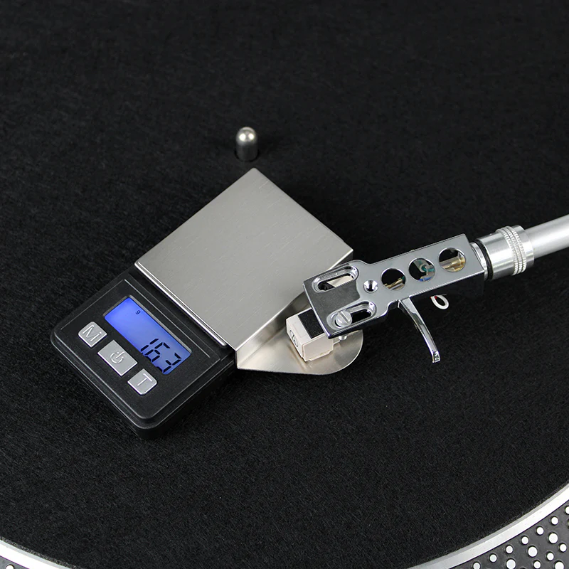 Power on the scale and make sure the empty scale reads 0 grams. Gently lower the tone arm so that the needle rests in the centre of the scale. Raise the tone arm and set tonearm weight to the recommended weight per your stylus’ specs. Do not adjust the tonearm weight while the needle is on the scale. Raise the tone arm and adjust the tonearm weight, then lower the needle onto the scale until you get the desired tracking force.